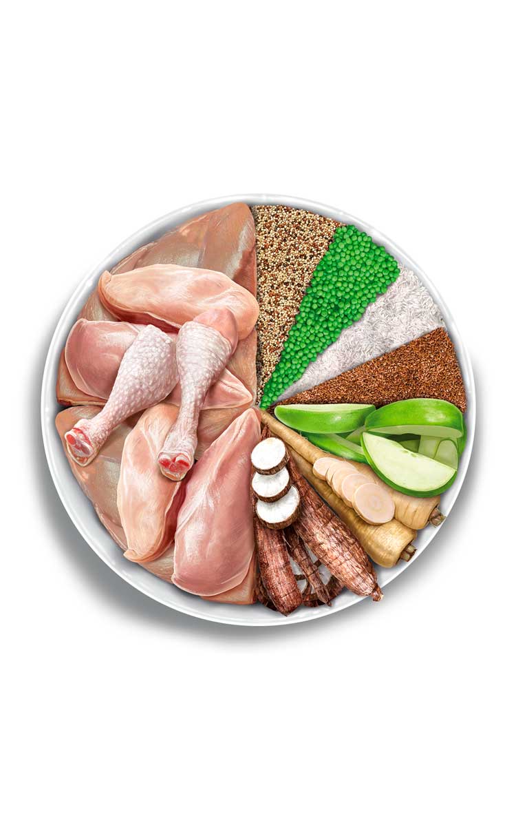 Samenstelling: vers bereide kip 71% (per 100 kg product gebruiken we 140 kg vers bereide kip), groene erwten, volkorenrijst, gehydrolyseerde kippenlever, biergist (Saccharomyces cerevisiae), erwteneiwit, tapioca, appelvezels, mineralen, visolie (beschermd door natuurlijke tocoferolen), kippenolie (beschermd door natuurlijke tocoferolen), psyllium, gedehydreerde pompoen, Antarctische krill, kelp, spirulina, quinoa 1000 mg/kg, arracacha 1000 mg/kg, gedehydreerde boerenkool, gedehydreerde pruimen 1000 mg/kg, cichorei (bron van fructo-oligosa- chariden (FOS)) 1000 mg/kg, gehydrolyseerde gistcelwand (bron van mannan-oligosachariden (MOS)) 1000 mg/kg, mandarijnextract, kurkuma 500 mg/kg, gember, yucca schidigera, rozemarijn.