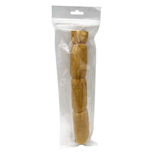Deze opgerolde paardenkophuid rol is geschikt voor lang kauwplezier. De staaf is ongeveer 27cm lang en 3cm in diameter. De rol is gedroogd en bevat geen kunstmatige toevoegingen. 100% paard dus!