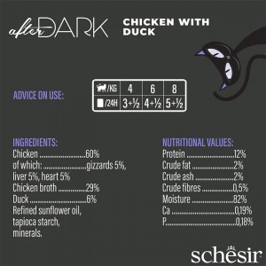 Een hoog eiwitgehalte met echte kipfilets in bouillon, samen met smakelijke en voedzame stukjes hart, lever, maagjes en heerlijke eend. 100% compleet en uitgebalanceerd recept, met alle eiwitten, vitaminen en mineralen die uw kat nodig heeft met echte stukjes voedingsrijke harten, levers en maagjes. rijk aan eiwitten, van echte kip en organen, plus eend in smakelijke filets in bouillon. rijk aan vloeistoffen, om de kat de nodige hydratatie te bieden. Graanvrij. minimaal bewerkte kwaliteitsingrediënten met een hoge voedingswaarde.