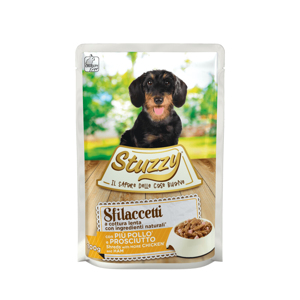 Stuzzy reepjes met kip en ham voor honden bereid met natuurlijke ingrediënten, langzaam gegaard om jouw hond een maaltijd te bieden die zowel compleet als rijk van smaak is. Langzaam koken. Met natuurlijke ingrediënten