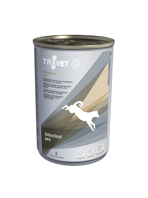 Door het gebruik van aardappel als koolhydratenbron en door de toevoeging van vezels wordt extra aandacht geschonken aan de verteerbaarheid van de voeding en aan een gezond spijsverteringsstelsel. Aan de voeding zijn verder zo weinig mogelijk andere ingrediënten toegevoegd om de spijsvertering zo min mogelijk te belasten. Trovet Intestinal DPD Hond bevat bovendien als enige eiwitbron eend en aardappel als enige koolhydratenbron, waarvan bekend is dat deze zelden overgevoeligheidsreacties veroorzaken. Hierdoor is de voeding ook geschikt voor honden met een voedselovergevoeligheid.