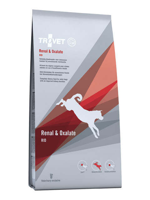 Trovet RID Renal & Oxalate bevat een beperkt gehalte hoogwaardige eiwitten, waardoor de belasting van de nieren lager is. Het sterk verlaagde fosforgehalte van Renal & Oxalate RID draagt bij aan een afremming van een verdere afname van de nierfunctie. Ook zijn de gehaltes aan mineralen en vitaminen aangepast aan de gewijzigde behoeften van honden met een verminderde nierfunctie. Renal & Oxalate bevat veel vitamine B6, zodat de kans op oxalaatvorming als gevolg van een vitamine B6 tekort wordt voorkomen. Een hond met nierproblemen voelt zich vaak ziek en heeft een slechte eetlust. Bij de samenstelling van Trovet Renal & Oxalate RID Hond is daarom extra veel aandacht besteed aan de smakelijkheid.