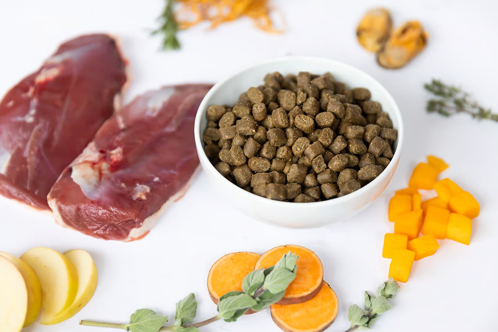 75% Vers Eendenvlees, 20% zoete aardappel, 3% gezondheidsmix: (banaan (5982 mg/kg), artisjok (4486 mg/kg), cichorei (4813 mg/kg), luzerne (2393 mg/kg), appels (2094 mg/kg), pompoen (1794 mg/kg), veenbessen (1495 mg/kg), groenlipmossel (1346 mg/kg), groene thee (1196 mg/kg), rozemarijn (1047 mg/kg), tijm (897 mg/kg), oregano (748 mg/kg), mariadistel (269 mg/kg), spirulina (239 mg/kg), olijfolie (209 mg/kg), yucca, cordyceps (179 mg/kg), shiitake, paardebloem, gember, kurkuma), 1% forelolie, glucosamine (1000 mg/kg), chondroïtine (850 mg/kg), msm (650 mg/kg).