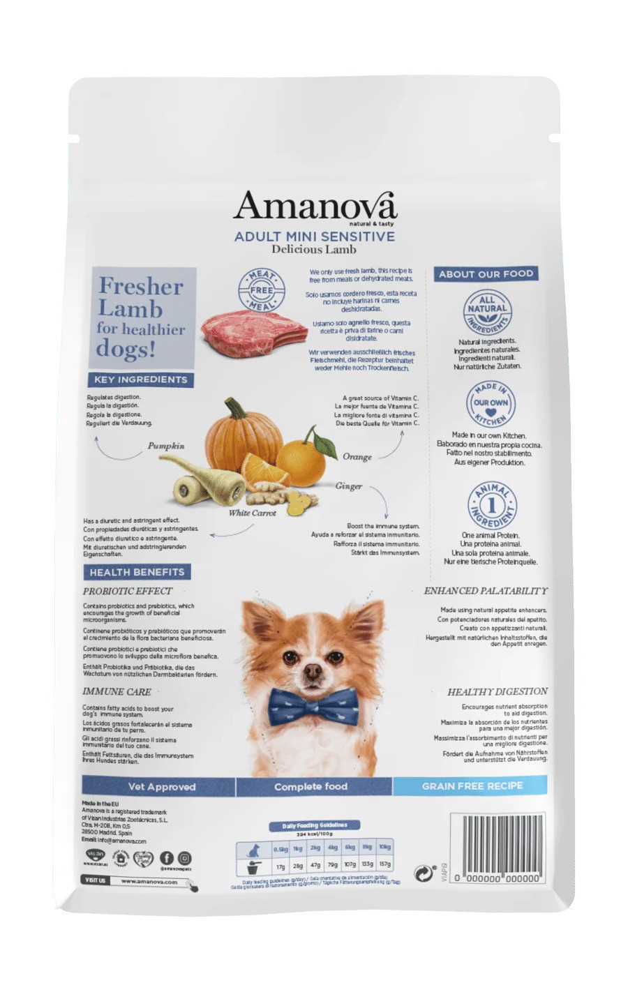 amanova adult mini sensitive is en graanvrije voeding voor volwassen honen van kleine rassen, met name voor honden met een gevoelige spijsvertering of die extra verzorging nodig hebben voor hun huid en vacht. bereid met vers lam als enige dierlijke grondstof, is het ideaal om mogelijke voedselallergieen en intoleranties te voorkomen. de speciale formule van dit heerlijke hondenvoer, ontwikkeld door onze dierenartsen, bevat belangrijke voedingsstoffen en superingredienten zoals pomopen, sinaasappel en gember die het immuunsysteem versterken. de combinatie van zink en vetzuren bevordert de schoonheid en gezondheid van de huid, vacht en slijmvlies.