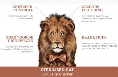 Dit super premium kattenvoeding is ideaal voor gesteriliseerde katten. Het is glutenvrij, laag in vet en gemaakt met alleen de meest verse stukjes kip. Onze gezonde recepten uit eigen keuken zijn 100% natuurlijk en vrij van diermeel. Ook gebruiken we eiwitten van hoge kwaliteit voor het behoud van spieren, essentiële vetzuren voor een gezonde huid en glanzende vacht en L-carnitine ter ondersteuning van het vetmetabolisme van uw kat. Verder voegen we vezels zoals psyllium, probiotica, quinoa en visolie toe om het maagdarmkanaal gezond te houden en een langdurig verzadigingsgevoel te geven. De toegevoegde vezels voorkomen daarnaast haarballen en kamille extract helpt het stressniveau te verlagen voor een gezonde en vrolijke kat.