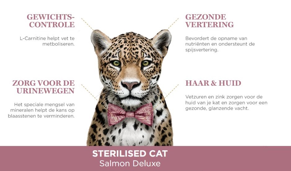 Deze super premium kattenvoeding is ideaal voor gesteriliseerde katten. Het is hypoallergeen, glutenvrij en gemaakt met de meest verse stukjes zalm. Onze gezonde recepten uit eigen keuken zijn 100% natuurlijk en vrij van diermeel. Het zit boordevol omega-6 vetzuren om de huid en vacht van uw kat gezond te houden. EPA en DHA zorgen voor een betere gewrichtsmobiliteit en L-carnitine zorgt voor ondersteuning van het vetmetabolisme. Daarnaast voegen we prebiotica, psylliumvezels en quinoa en gember aan de voeding toe voor een goed werkend maagdarmkanaal en een langdurig verzadigingsgevoel. Het toegevoegde kamille extract helpt het stressniveau van uw kat te verlagen, voor een gezond en gelukkig kattenleven.