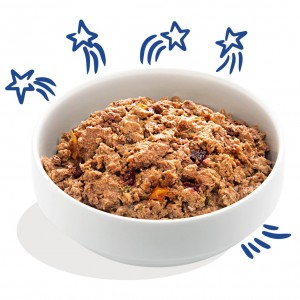 Dit graanvrije recept boordevol lekkere zalm en kalkoen is een fantastische bron van eiwitten. De zalm is goed voor omega 3 en gezonde vetten én is een evenwichtige en makkelijk verteerbare eiwitbron. De sappige kalkoen zorgt voor magere eiwitten. Dit recept bevat prebiotica voor een gezonde darmflora. Als extra voedzame bonus doen we er nog orgaanvlees (zoals hart en lever) bij. Onze recepten bevatten ook een supergezonde mix van fruit en groenten plus voedzame kruiden en botanicals. Die fantastische blend stomen we zachtjes om alle smaken en goodies optimaal te bewaren.