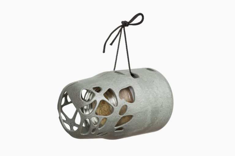 Esmee is een gereclyclede houder voor pindakaaspotten en vetbollen. De houder is voorzien van een touw zodat je hem makkelijk kan ophangen op een leuke plek in de tuin. Een leuke en veilige manier om voer aan te bieden aan kleinere tuinvogels!