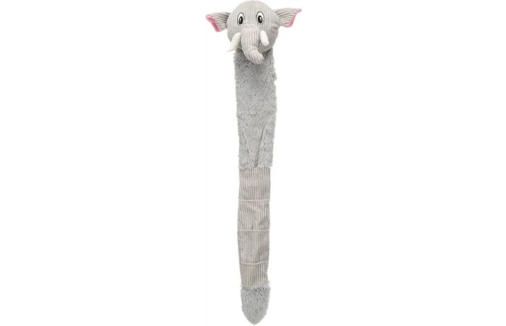 Laat je harige vriend lekker ravotten met dit lange schattige grijze olifantje! Gemaakt van zacht pluche en afgewerkt met ribfluweel. Stop wat lekkers in z'n buik en laat het speelplezier beginnen met squeaker en knispergeluiden. Plezier gegarandeerd!