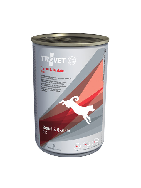 Trovet RID Renal & Oxalate bevat een beperkt gehalte hoogwaardige eiwitten, waardoor de belasting van de nieren lager is. Het sterk verlaagde fosforgehalte van Renal & Oxalate RID draagt bij aan een afremming van een verdere afname van de nierfunctie. Ook zijn de gehaltes aan mineralen en vitaminen aangepast aan de gewijzigde behoeften van honden met een verminderde nierfunctie. Renal & Oxalate bevat veel vitamine B6, zodat de kans op oxalaatvorming als gevolg van een vitamine B6 tekort wordt voorkomen. Een hond met nierproblemen voelt zich vaak ziek en heeft een slechte eetlust. Bij de samenstelling van Trovet Renal & Oxalate RID Hond is daarom extra veel aandacht besteed aan de smakelijkheid.